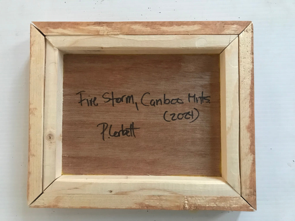 Fire Storm, Cariboo Mountains (2024) 8x10 oil on panel in a rustic exhibition style shadow box frame