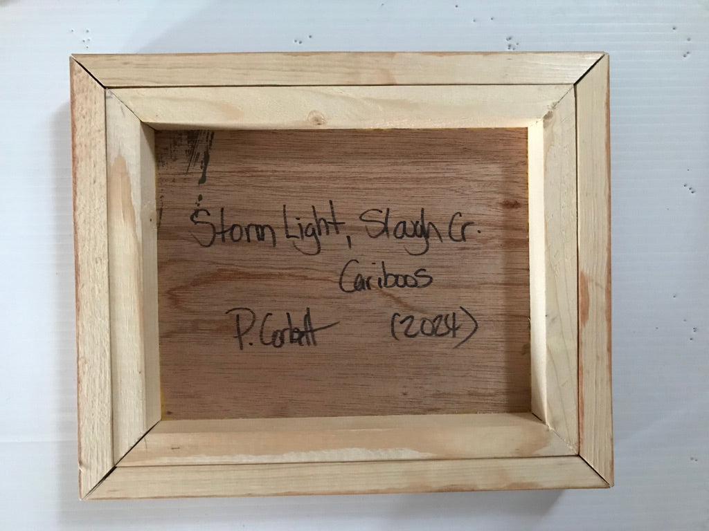 Storm Light, Slough Creek, Cariboos (2024) 8x10 oil on panel in a rustic exhibition style shadow box frame